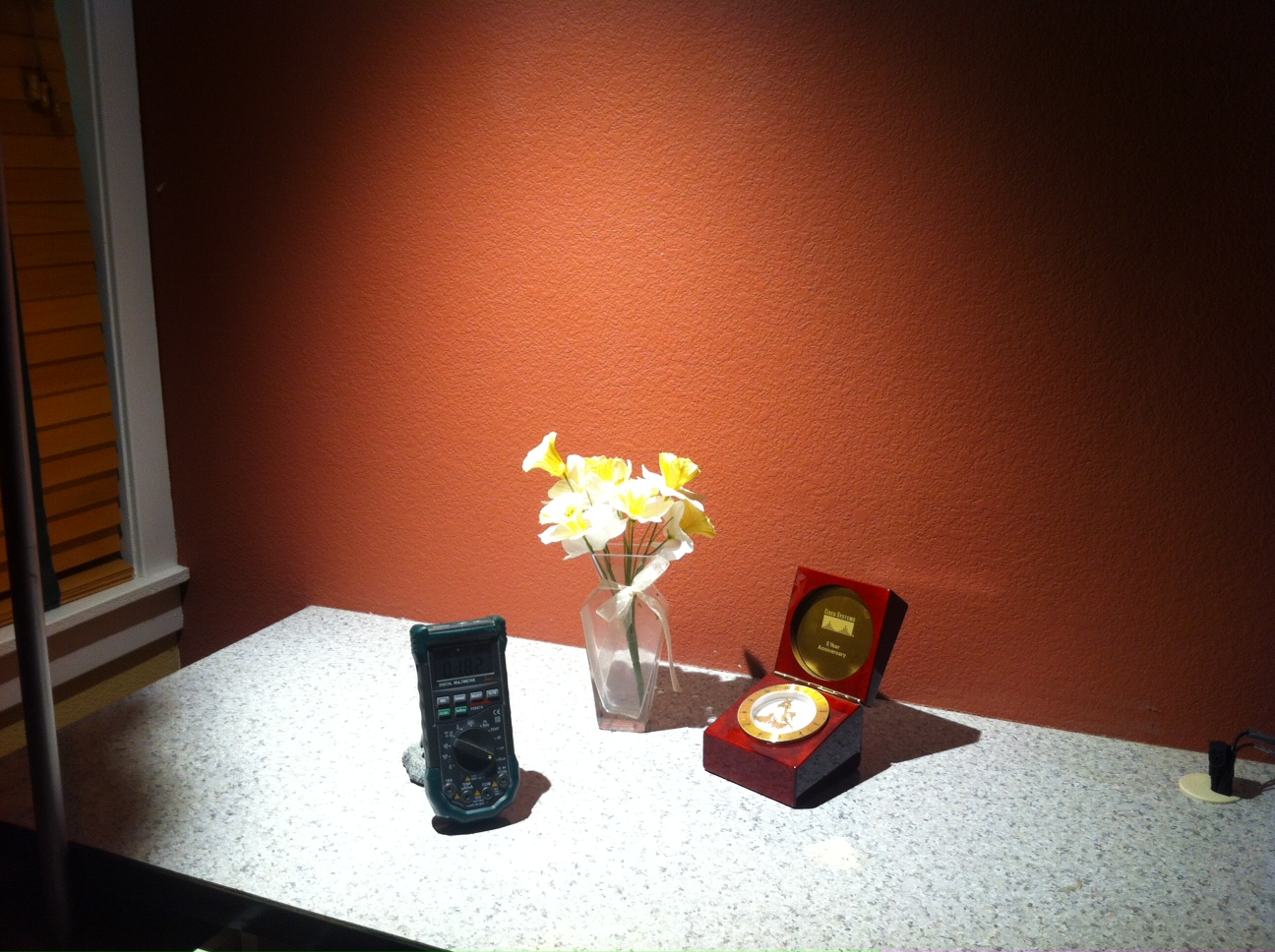 This sample scene in my testing area is lit up with the yellowy light of an incandescent bulb.