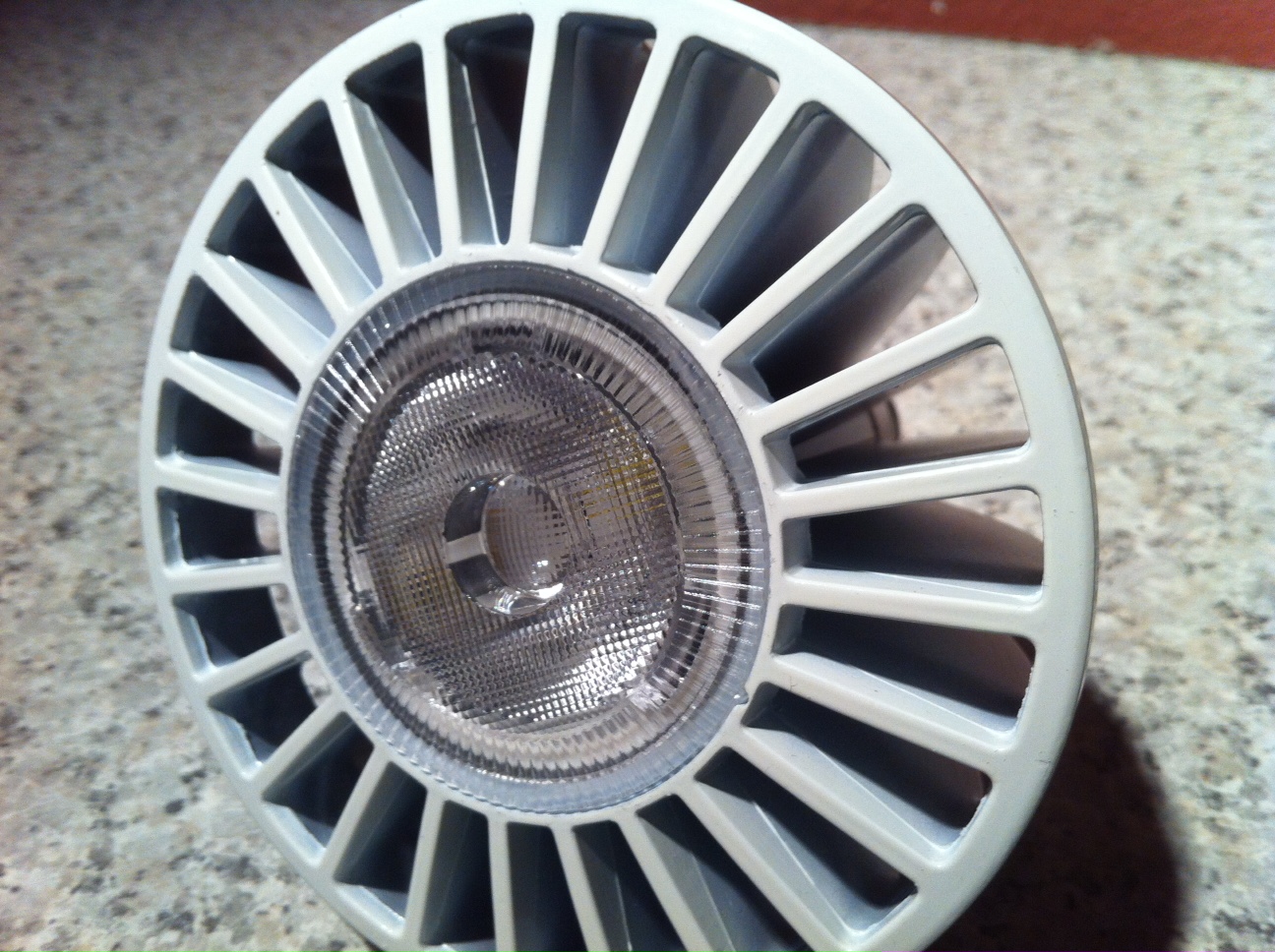 Power consumption was also a pleasant surprise. I measured these bulbs at only 10 watts, significantly lower than their 14 watt spec. But because of the focused beam, the usable amount of light is almost as much as the 24 watt LED bulb from EcoSmart, at least for my own purposes. The efficiency really shows up in the “lumens per watt” measurement. This bulb is almost doubling the efficiency of the other LED bulb, and of CFLs as well! The 14 watt savings works out to about 15 kWh/year ($1.50-ish) at 3 hour-per-day usage.
