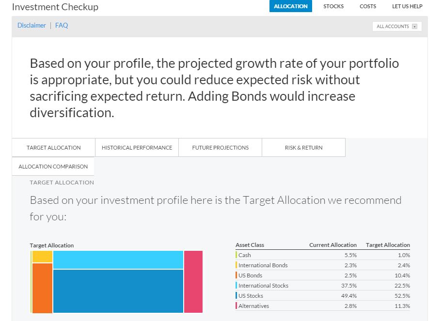 In my case, I get reasonable marks because I do keep most money invested at all times in a mostly-stock portfolio. But I have slightly too much cash because I recently sold a rental house and haven’t finished investing the proceeds. I also prefer a lower bond allocation than most people, because volatility doesn’t bother me at all. However, Personal Capital’s allocation guidelines are solid and if you just follow the recommendations you will probably do better than most of the investing public.