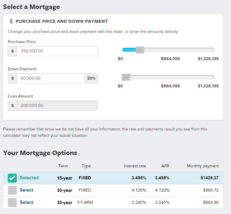 But the most interesting part to me is that you can then slide your loan amount and downpayment back and forth to strategically get the best rate for your own situation. Considering a smaller downpayment so you can keep cash in reserve to buy a rental property next year? You can instantly see how much that will cost you. Comparing 15 to 30 year and fixed to ARM? All that data is right there and it adjusts in real time.
