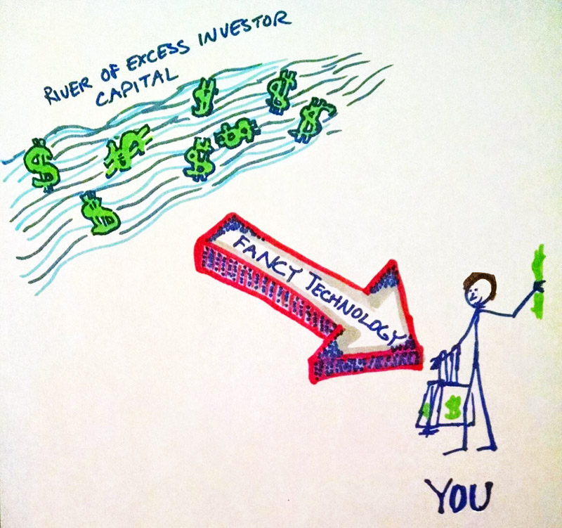 I have also been frustrated with the perpetually low-tech environment of lending. Although I now maintain a peaceful balance sheet with no debt, I’ve gone through at least ten mortgages and refinancings over the past 15 years, and every one was more trouble than it needed to be. Sometimes I’d find myself sitting in a bank employee’s cubicle slowly reciting figures while she typed them into boxes of some rusty old Windows XP application. Other times I’d be signing and scanning paper documents and using various hacks to send them in the antique “Fax” format to bankers who didn’t even have a way to open a PDF.