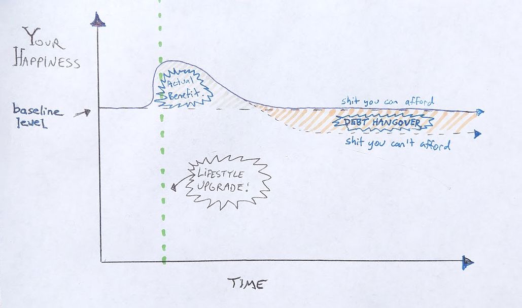 But in the typical outcome, most of us make changes that produce only a short bump, and then may even come back to haunt us with a payback time (which I labeled the “debt hangover” in the picture). Anything that puts you into debt, makes you less healthy or otherwise compromises your ability to live a happy life fits into this category.