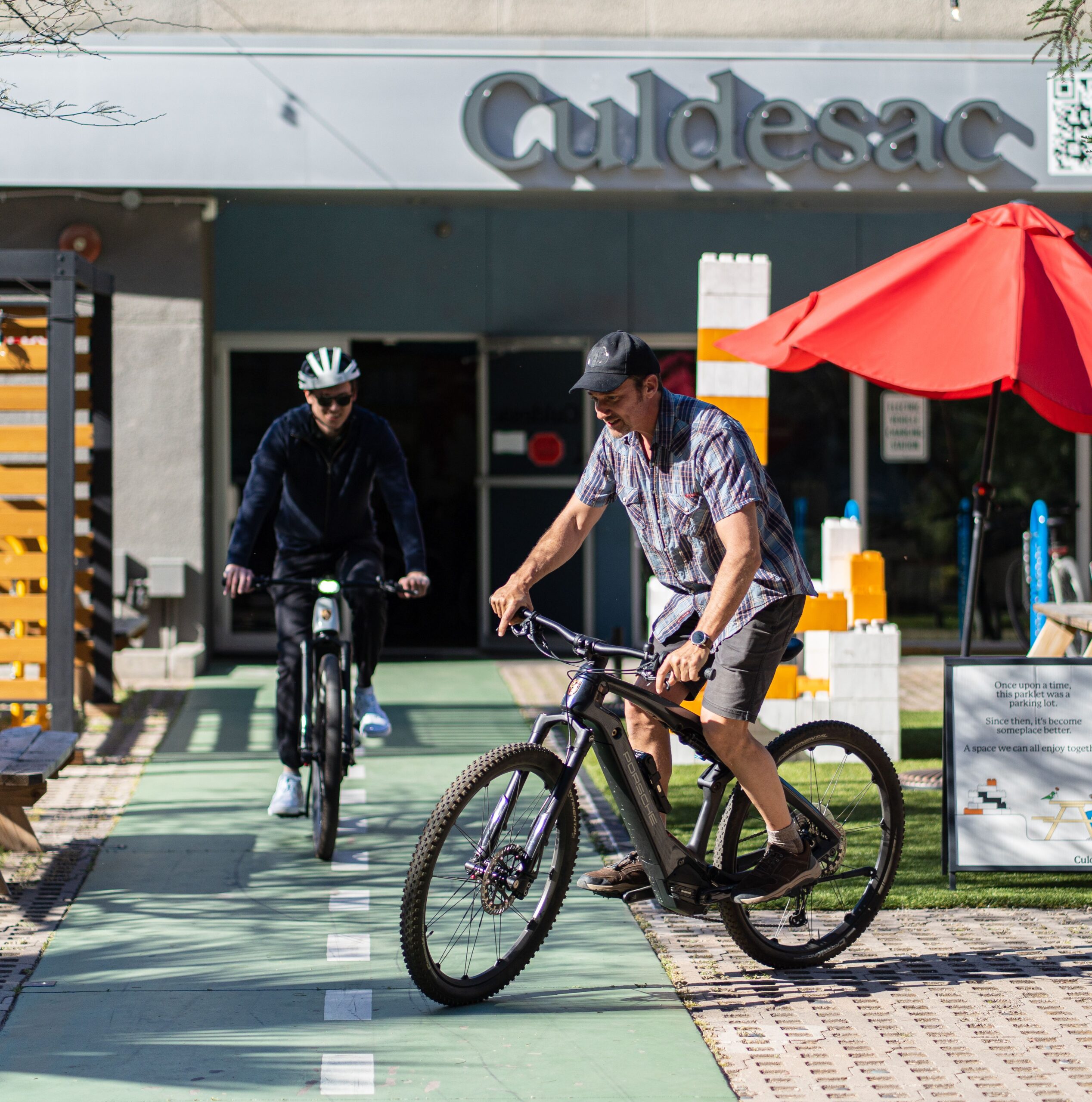 Clockwise: Culdesac office replaced their own parking lot with a mini-park. Culdesac head of marketing Blythe Ingwersen and co-founders Jeff Berens and Ryan Johnson showed me around and lent me a nice Porsche e-bike for a tour of the city!
