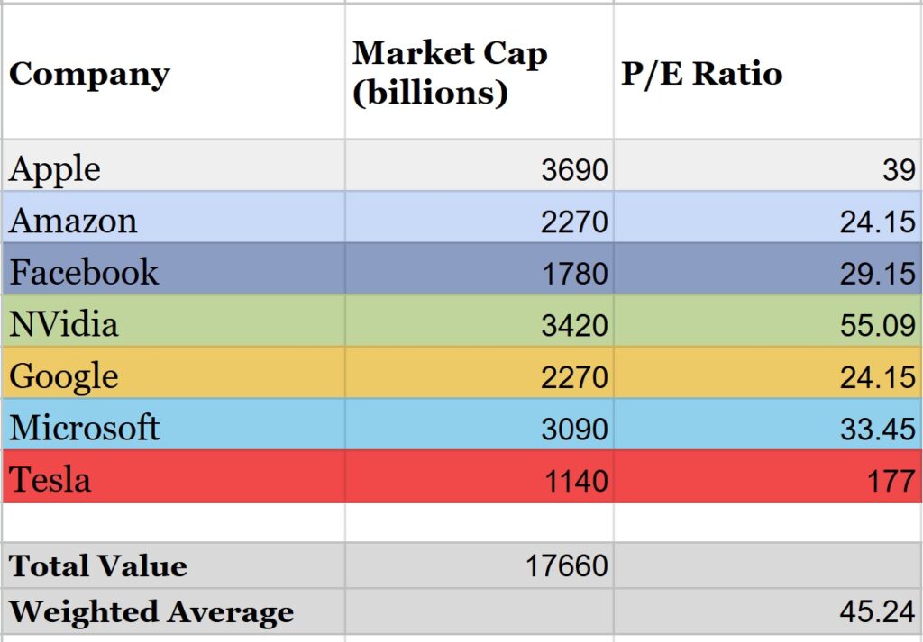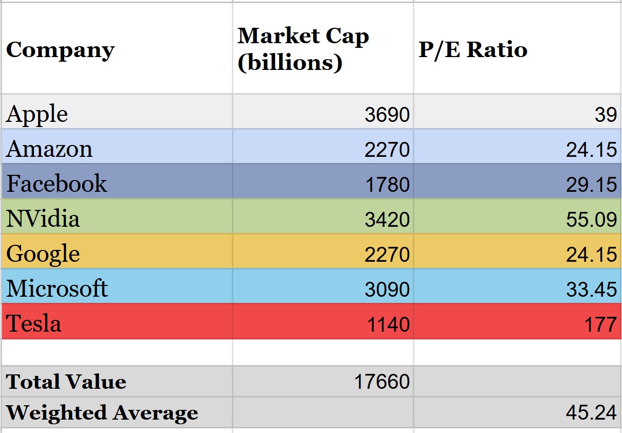 These are all high-flying, super profitable tech companies who have seen a lot of growth and hype recently, which has caused investors to get excited and bid up their share prices in hopes of even more future growth. Collectively, they make up over 25% of the entire market value ($17.66 trillion!) and have much more expensive P/E ratios than the rest of the market (a weighted average of about 45)