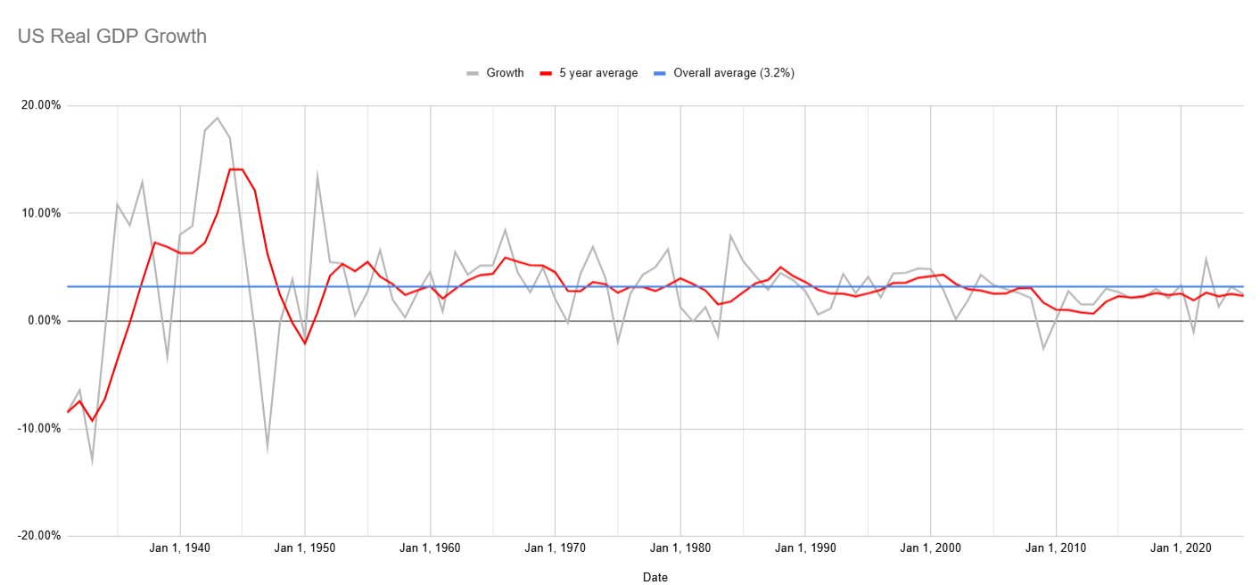 While the future is unknown, it can still be useful to use the past as a guide. After all, if you look at the history of US economic growth over time, it averages out to a surprisingly steady figure, decade after decade: about 3% after inflation.